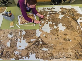 Conservator Claire Thomson works on the map, which has eight sections and is more than 2m wide. She describes it as “the most difficult project I have ever tackled” “Nova Totius Terrarum Orbis Tabula (new [Meer…]