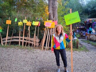 Van uw correspondent is deze door waterstofgas aangedreven sculptuur te zien. Helemaal links tegen het raam gedrukt drie zonnecellen die stroom opwekken, met die stroom wordt in de energie-omvormer (die glazen buisjes hieronder) gedestilleerd water omgezet in waterstof en zuurstof. Eigenlijk werkt de opslag van stroom in waterstof als een soort van batterij. Met een knop kan je de sculptuur laten switchen tussen het opwekken van energie en het gebruiken van energie (= het laten draaien van de tekst).